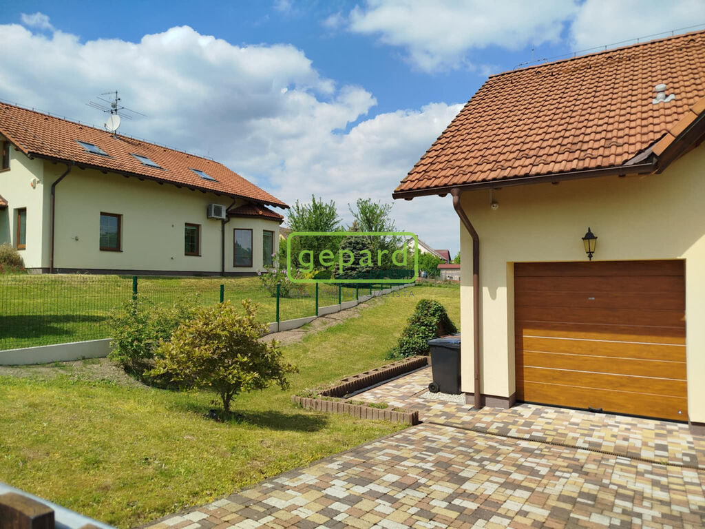 Okolo domu je kompletně oplocená, udržovaná zahrada s terasou a množstvím plodících a okrasných stromů a keřů, možnost vjezdu na pozemek a dálkově ovládaná vrata.