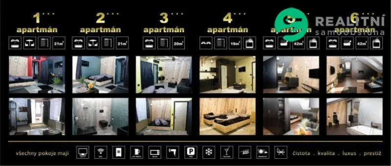 6 apartmánů, včetně recepce, snídaňové místnosti a venkovní terasy 150 m2