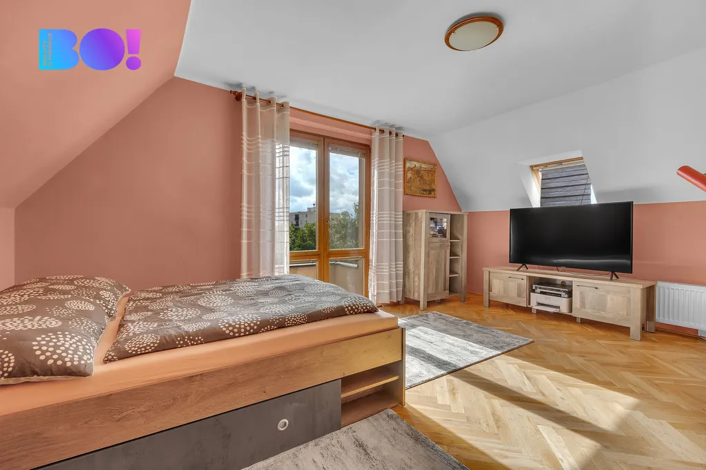 V prvním patře se nachází dětský pokoj, ložnice se vstupem na obytnou půdu, šatna a WC.