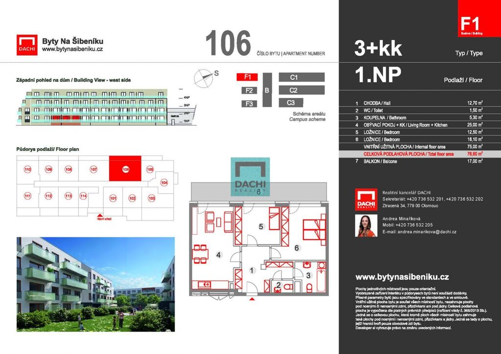 Navazujeme na úspěch první etapy a přinášíme vám jedinečnou příležitost pořídit si nový domov v atraktivním projektu Byty Na Šibeníku. DACHI, prodejce a partner developera, vám v rámci druhé etapy nabízí ke koupi byt 3+kk (č. 106) o ploše 78,6 m s balkonem o velikosti 17 m. Byt se nachází v 1. nadzemním podlaží bytového domu F1, který je součástí šestipodlažního objektu se čtyřmi nadzemními a dvěma podzemními podlažími.