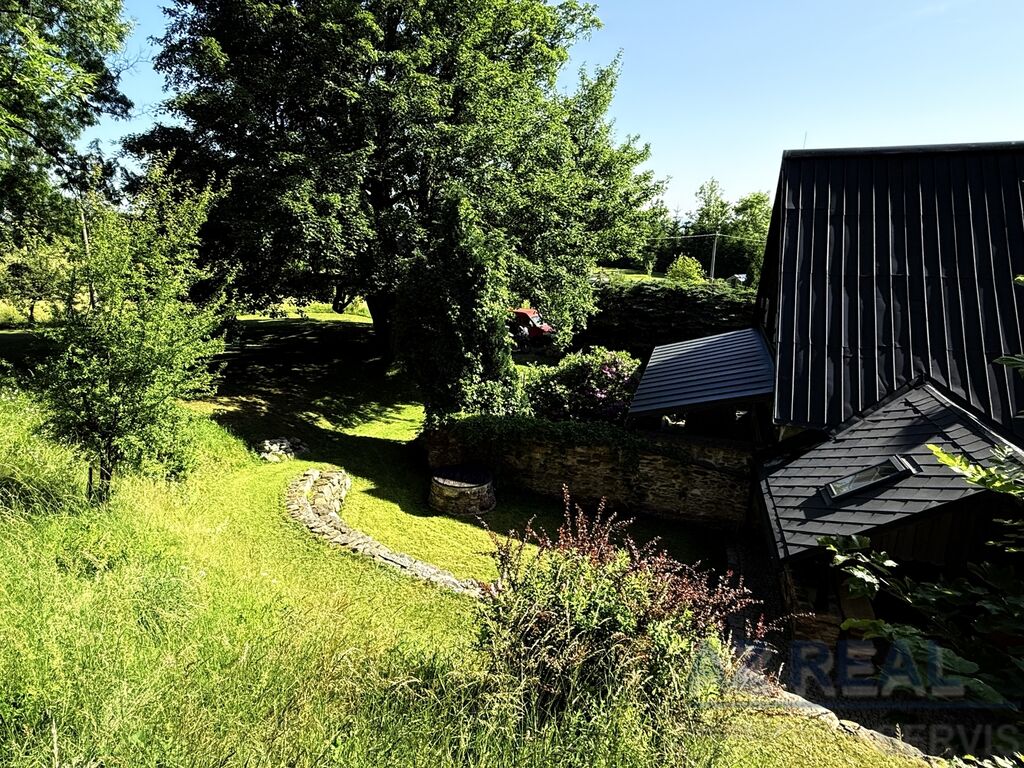 Kolem domu proběhly rozsáhlé terénní úpravy z kamene, na zahradě je kryté posezení s výhledem do lesa a okrasná zahrada na jižní straně.