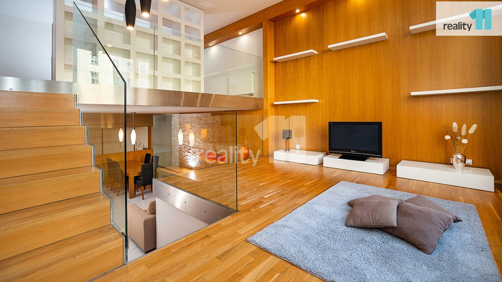 Byt, jehož obytná plocha je 103,52 m², je vícepodlažní. Po vstupu do bytu vejdeme do chodby, ze které se vchází do technické místnosti s pračkou, šatny a samostatné toalety. Dále se odtud vchází do kompletně zařízené kuchyně, s moderní kuchyňskou linkou, která je částečně skryta za posuvnými dveřmi, čímž vzniká krásný, čistý prostor s velkým jídelním stolem a pohovkou. Po několika schodech se dostaneme do obývacího pokoje, s velkým oknem, s výhledem do příjemného vnitrobloku. Odtud se pak opět po několika schodech vstupuje na galerii, která slouží jako ložnice, je zde další šatna a koupelna s vanou a toaletou. Celý byt je vzdušný, s dostatkem světla, důmyslně vytvořenými úložnými prostory a zajímavými prvky.
