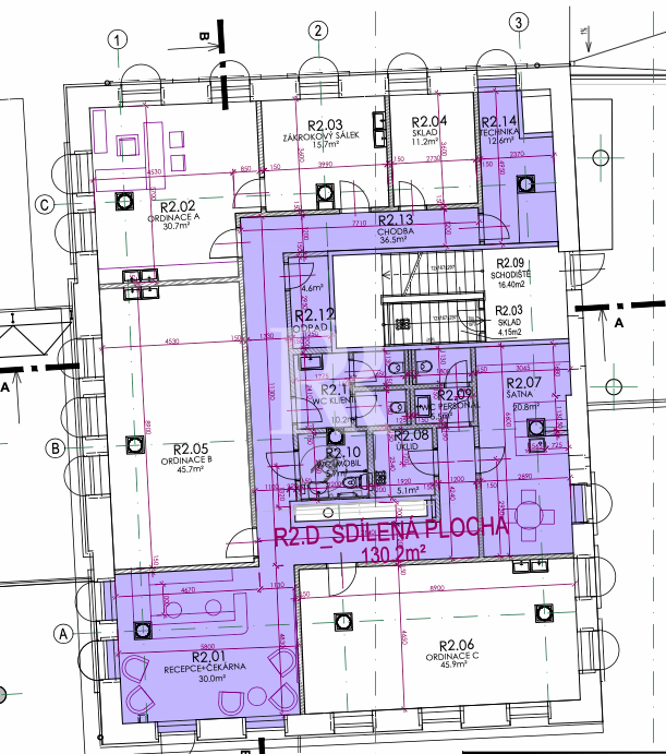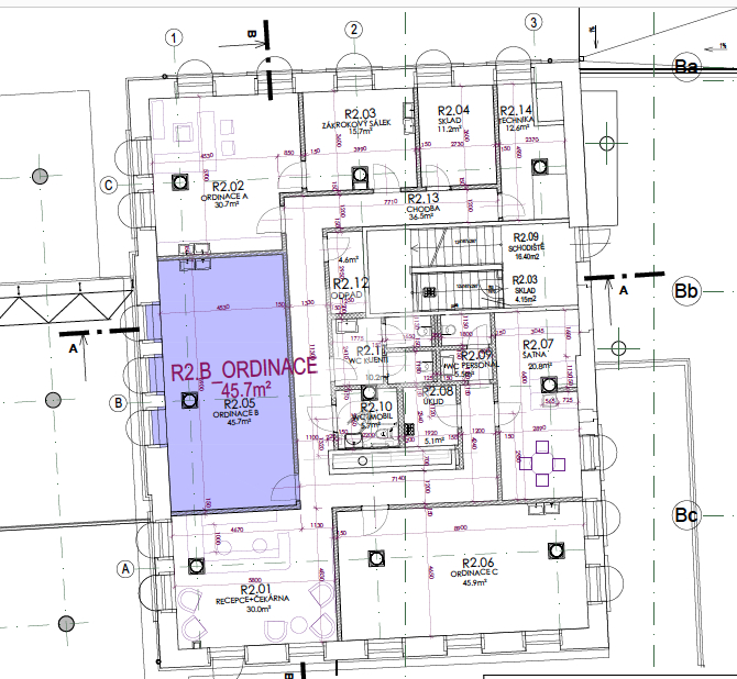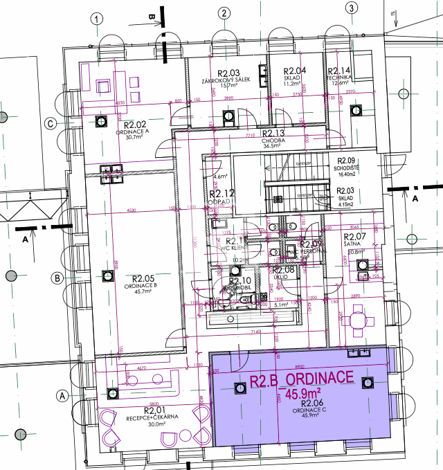 Ordinace 45,9m2 je zcela samostatná (viz. půdorys), avšak bude mít společnou čekárnu, recepci, sociální zázemí pro pacienty i denní místnost pro personál. Předpokladem je, že recepční bude sdílena lékaři, tak aby byl zajištěný absolutní servis pro pacienty.
