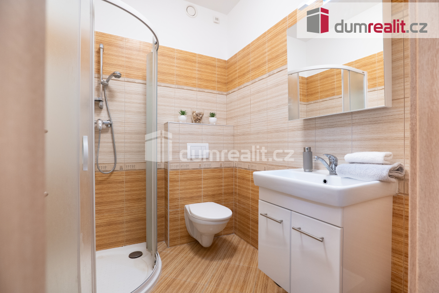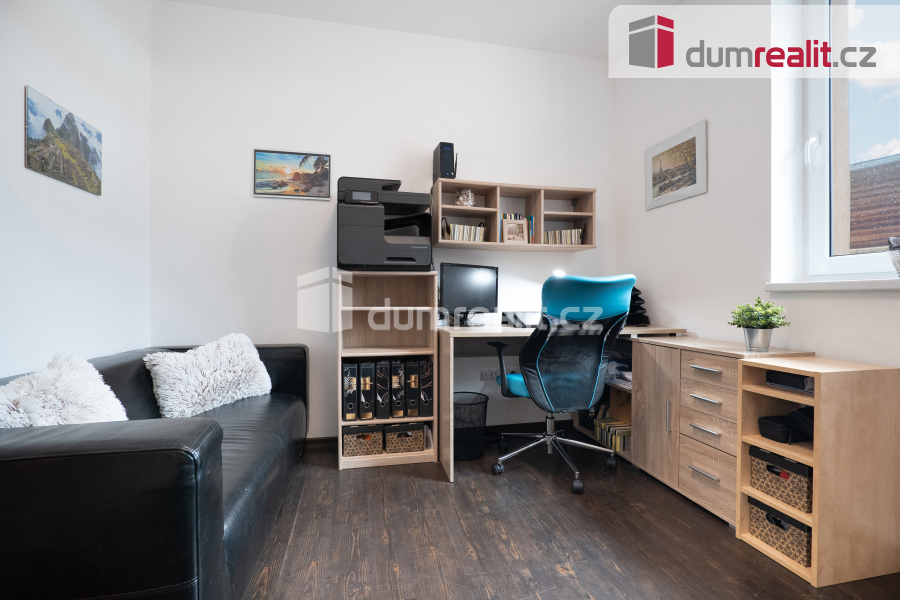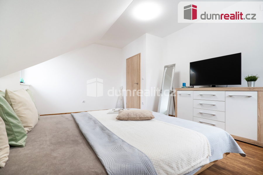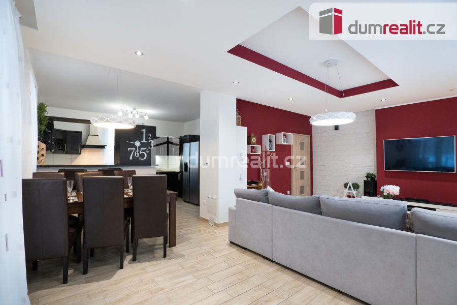 Interiér domu je navržen tak, aby splňoval všechny požadavky moderního bydlení. Dominantním prostorem je prostorný obývací pokoj s jídelnou, která je propojena s velkou kuchyní s barovým pultem. Tento otevřený prostor o velikosti více než 50 m² je ideální pro společné chvíle s rodinou i přáteli. Z obývacího pokoje je přímý vstup na zastřešenou terasu (28 m²), která nabízí skvělé místo pro relaxaci a venkovní posezení po celý rok. Příprava pro krb v obývacím pokoji je již hotová, což vám umožní snadno doplnit domov o útulnou atmosféru. V přízemí najdete také praktické zázemí, včetně vstupní haly s vestavnou šatní skříní, samostatné spíže, malé koupelny s toaletou a sprchovým koutem, pracovny a technické místnosti s přístupem do malého sklípku. Případně je zde možnost úpravy dispozice na 6+kk, což nabízí flexibilitu pro větší rodinu nebo specifické potřeby.