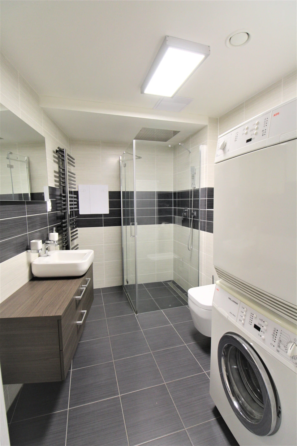Byt se nabízí částečně vybavený. Moderní kuchyňský kout disponuje vestavěnou lednicí, sklokeramickou varnou deskou a mikrovlnou troubou. Od obývací části je kuchyně oddělena stolek s barovými židlemi. V obývací části zůstává k dispozici televizní stolek a televize, velkou výhodou jsou žaluzie na dálkové ovládání. Prostorná koupelna je vybavena pračkou a sušičkou, sprchovým koutem, umyvadlem, toaletou, velkým zrcadlem a skříňkou s úložným prostorem.