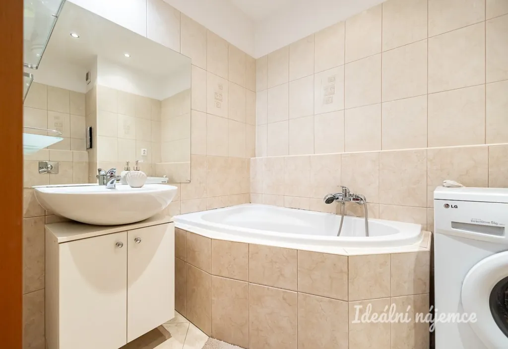 Byt se nabízí plně vybavený. Kuchyně disponuje lednicí, myčkou, elektrickou troubou, indukční varnou deskou, mikrovlnnou troubou a digestoří. Obývací část je zařízena pohovkou, konferenčním stolem, televizním stolkem s televizí a jídelním stolem s dvěma židlemi. Součástí ložnice je postel s matrací, noční stolek, pracovní stůl se židlí a šuplíky. V koupelně je vana, umyvadlo, pračka a toaleta. V předsíni je vestavěná šatní skříň a botník.