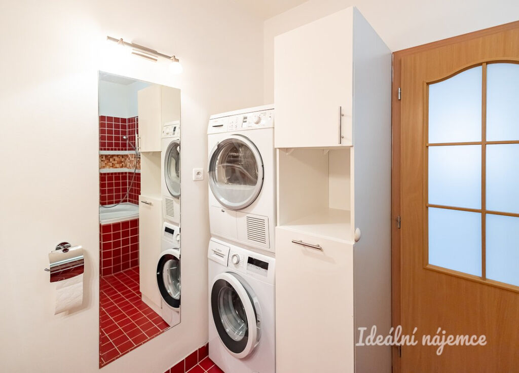Byt je zařízen tak, jak vidíte na fotografií. Pračka, sušička, postel v ložnici a několik šatních skříní.