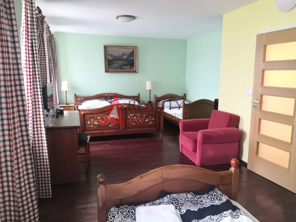 Nabízíme exkluzivně prodej krásného penzionu, který majitel získal od šlechtického rodu "Kolowratů". I díky těmto majitelům je penzion nenásilně zařízen v zámeckém stylu. Za budovou se nachází menší pergola pro uzavřenou společnost. V penzionu je 9 pokojů. Každý má samostatnou koupelnou a WC. Celková kapacita penzionu je 26 lůžek (3x 4lůžkový, 2x 3lůžkový, 4x 2lůžkový pokoj). Na moderně zařízenou kuchyň navazuje stylová restaurace s barem a 2 velké venkovní terasy (1 krytá, 1 otevřená). V případě zrušení kuchyně a zachování pouze přípravny pro snídaně a jídelny je možné z kuchyně vybudovat další 2 apartmány.