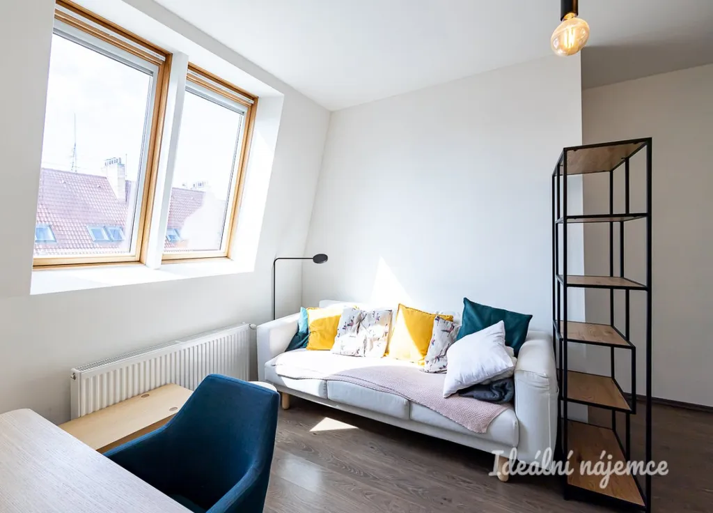 Obývací pokoj, který je přímo napojený na kuchyň je zařízen pohovkou, pracovním stolem se židlí a regálovou policí.