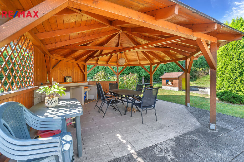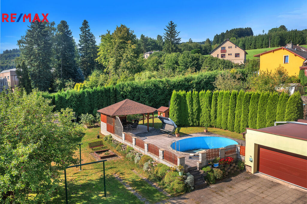 Na zahradě je k dispozici velká garáž, ze které se dá vybudovat další obytná místnost či dvě. Dále bazén, pergola a další malá stavba sloužící jako skládek.