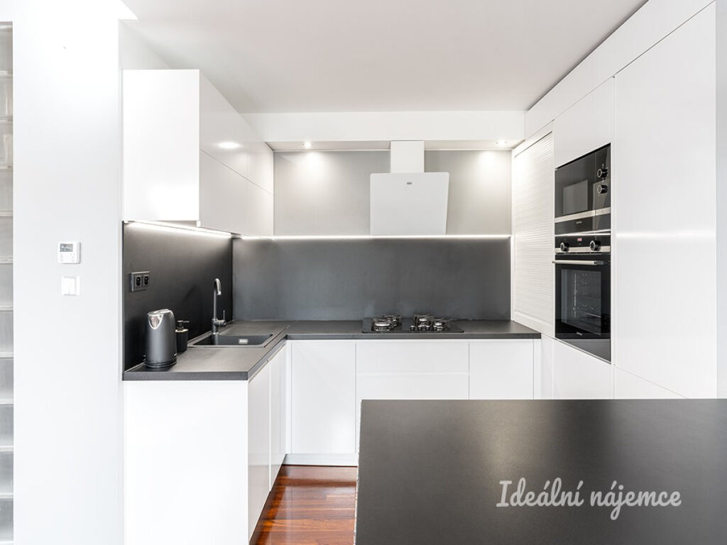 Kuchyně vyrobena na míru je zařízena všemi vestavnými spotřebiči - vestavná trouba, indukční deska, mikrovlnná trouba, odtahová digestoř, myčka a lednice.