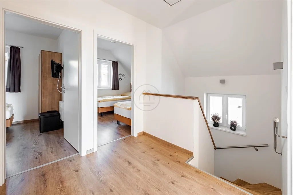 Dům s kapacitou až pro 8 osob poskytuje unikátní zázemí k rekreaci pro Vaší rodinu i budoucí klienty. Je navržen v souladu se šumavskou architekturou a důrazem na kvalitu stavebních materiálů, disponuje prostorným zádveřím, třemi ložnicemi, koupelnou se soukromou saunou, odděleným WC, technickou místností, dále velkým obývacím prostorem s kuchyní a vstupem na krytou terasu, s výhledem na Lipno a přístupem na vlastní zahradu. Součástí objektu je příplatkové vybavení, dřevěný obložený štít, kvalitní podlahy, venkovní elektrické žaluzie a peletková krbová kamna. Cena domu zahrnuje veškerý nábytek, vybavení, elektrospotřebiče a vlastní parkovací stání.