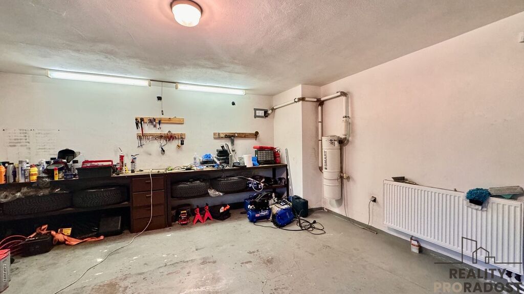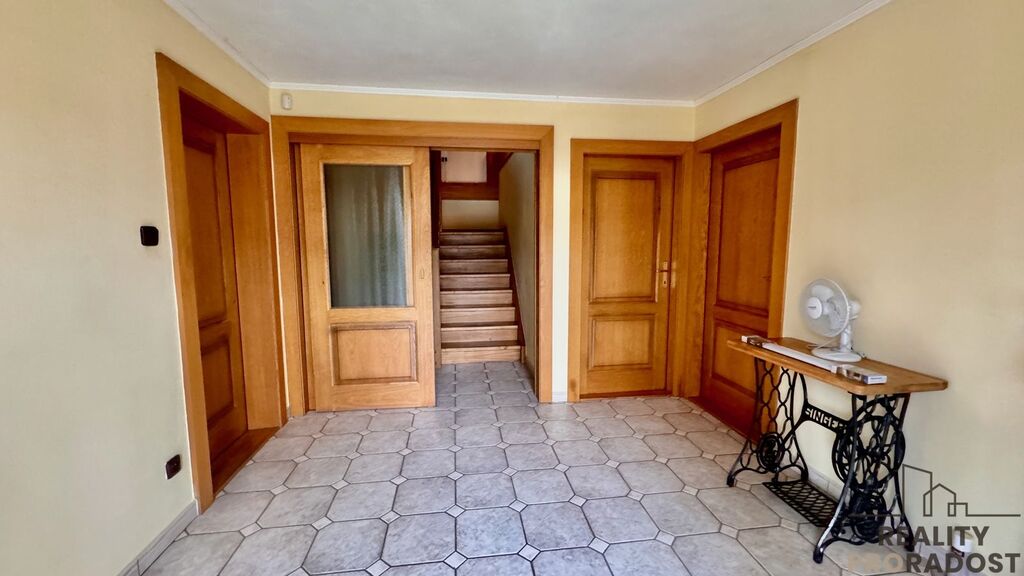 Dispozice domu zahrnuje čtyři ložnice, dvě koupelny a dvě toalety. Prostorný obývací pokoj s krbem je propojen s plně vybavenou kuchyní. Součástí je také samostatná pracovna vhodná pro domácí kancelář. Nechybí technické a úložné prostory ani dva balkony. K dispozici je i velká uzavřená garáž. Dům je vybaven novým kondenzačním plynovým kotlem a bojlerem, centrálním vysavačem a venkovními žaluziemi.