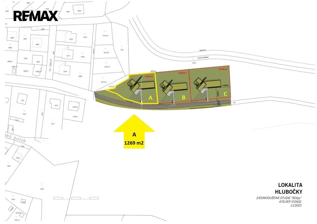 Konkrétně, tento nabízený stavební pozemek má výměru 1269 m² a je v inzerovaném situačním plánku pracovně označen písmenem "A".