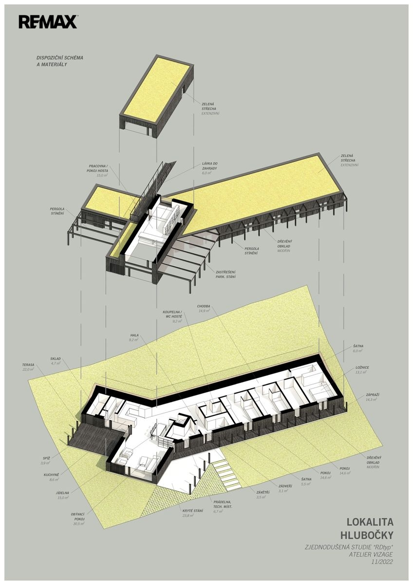 Jednopodlažní dům s obytným podkrovím o celkové užitné ploše 178,6 m² a dispozicí 5+1 je situovaný z části na rovinatém a z části na svažitém terénu. Dům se prodává ve standardu hrubé stavby. Ta zahrnuje základovou desku, hydroizolaci a tepelnou izolaci, stavbu z keramických pálených cihel o minimální tloušťce zdiva 440 mm včetně překladů a věnce, klempířské prvky, hliníkové okenní rámy s trojsklem, dále oplocení, pergolu, finální fasádu, bílou omítkovinu a kompletní dřevěné prvky.
