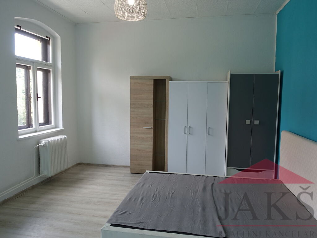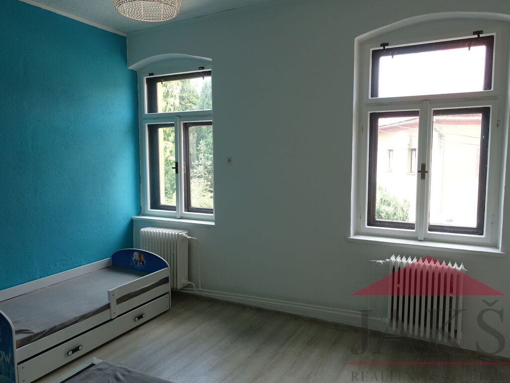 Popis: chodba se vstupem na lodžií, komora s oknem, koupelna (vana, umyv., el. boiler, pračka) s oknem, samostatné WC s oknem, prostorná průchozí kuchyně (kuch. linka s horkovzdušnou troubou, sklo-ker. deskou a lednice) s jídelnou a etážovým topením (kotel Dakon 16 na T.P.), průchozí obývací pokoj s krbovými kamny a velká zařízená ložnice.