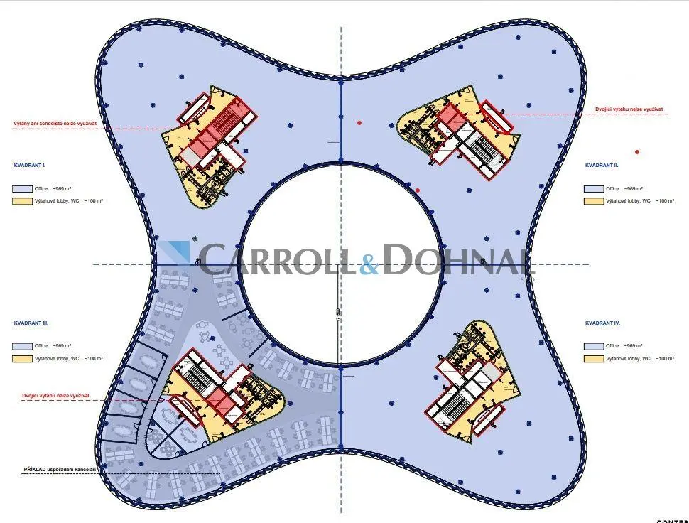 Nabízené prostory se nacházejí ve 2.NP budovy a jsou rozděleny dle tvaru budovy na 4 segmenty (kvadranty), každý o velikosti 969 m2, je možné pronajmout 1,2,3 nebo všechny 4 segmenty.