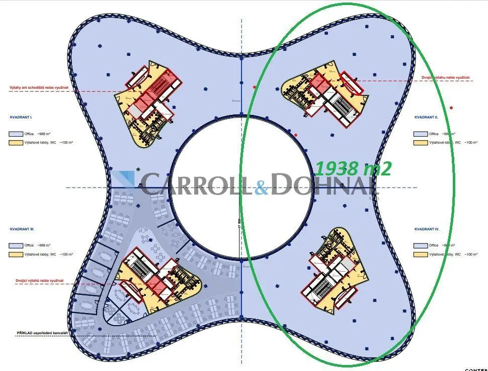 Nabízené prostory se nacházejí ve 2.NP budovy a jsou rozděleny dle tvaru budovy na 4 segmenty (kvadranty), každý o velikosti 969 m2, je možné pronajmout 1,2,3 nebo všechny 4 segmenty.