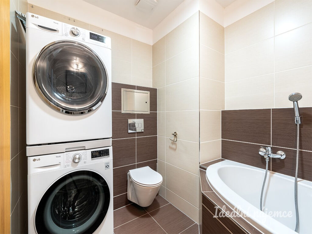 Skládá se ze vstupní chodby s vestavnými skříněmi, ložnice, dvou dětských pokojů a obývacího pokoje společného s kuchyňským koutem. Ze všech pokojů lze vejít na 67m2 jižně orientovanou terasu. Všechny pokoje také disponují svými šatními skříněmi. Dále je tu koupelna společná s toaletou vybavena vanou, pračkou a sušičkou.