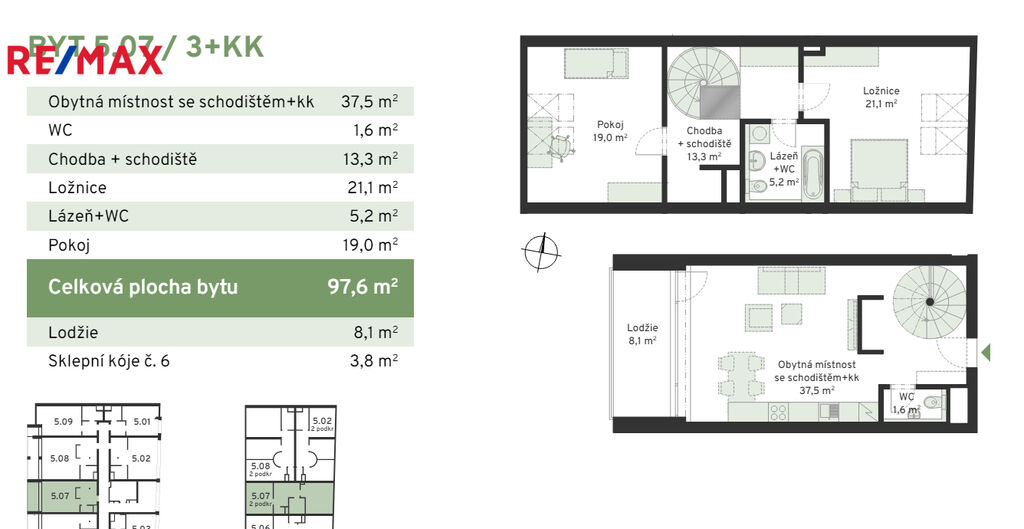 Po točitém schodišti se dostanete do horního patra bytu, kde je chodba s prostorem pro vestavěnou skříň, vstup do koupelny s vanou a WC, hlavní ložnice a samostatný pokoj.