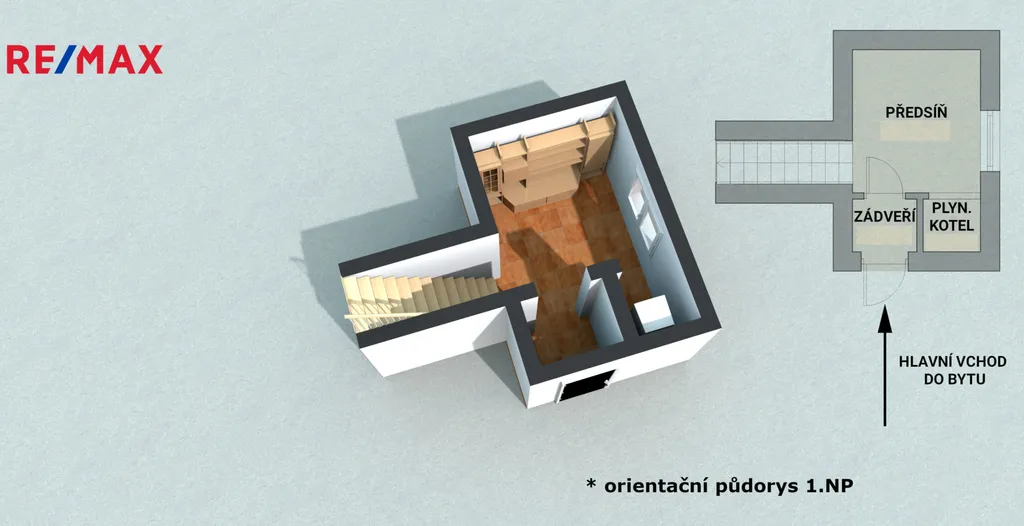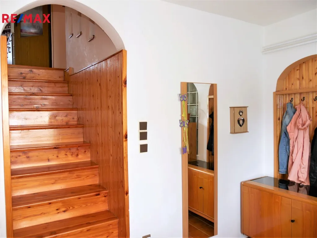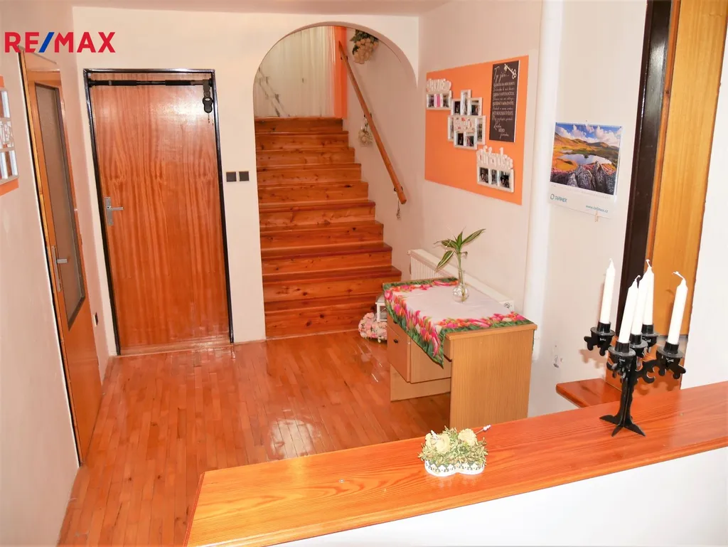 Byt je umístěný ve 2. NP a vstup má zajištěn z 1. NP, kde je umístěno zádveří (prostorná předsíň s umístěným kombinovaným plynovým kotlem) a dřevěným schodištěm do 2. NP. Zde se nachází byt o dispozici 4+1 s balkonem. V 1. PP se nachází prostorný sklep, menší sklípek a technická místnost .