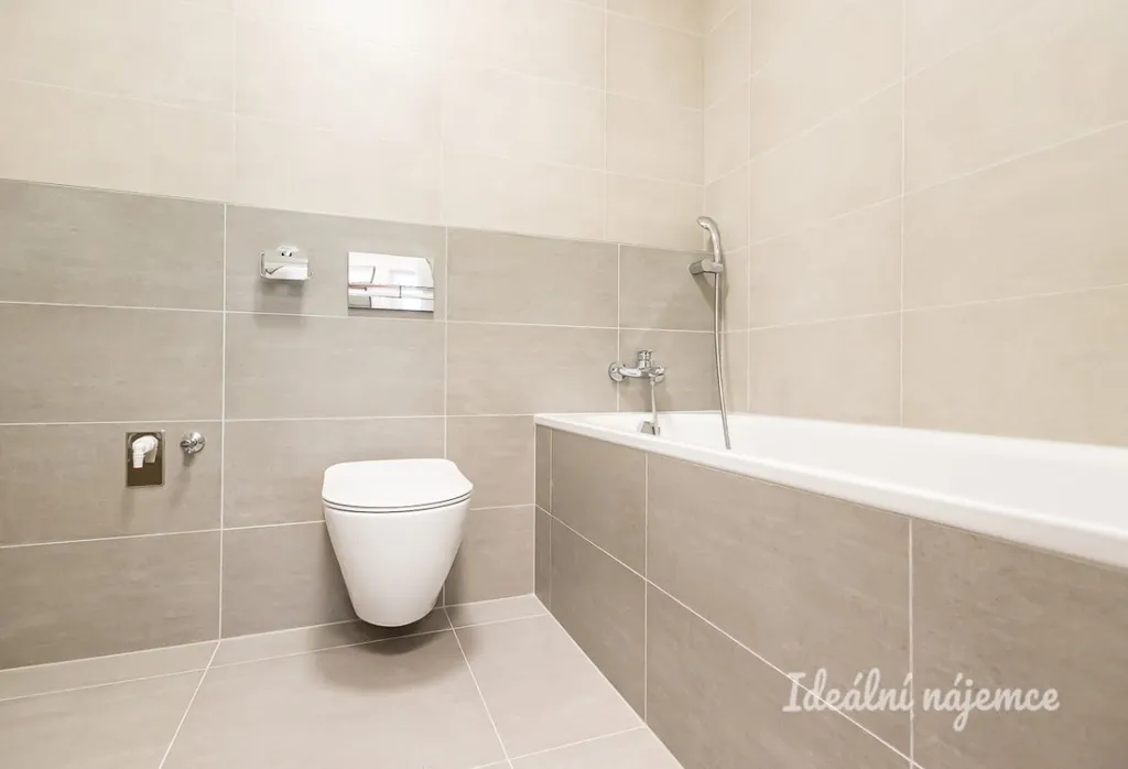 Z prostorné předsíně s velkým nástěnným zrcadlem je vstup do nadčasové koupelny s vanou, závěsnou toaletou a přípojkou pro pračku.