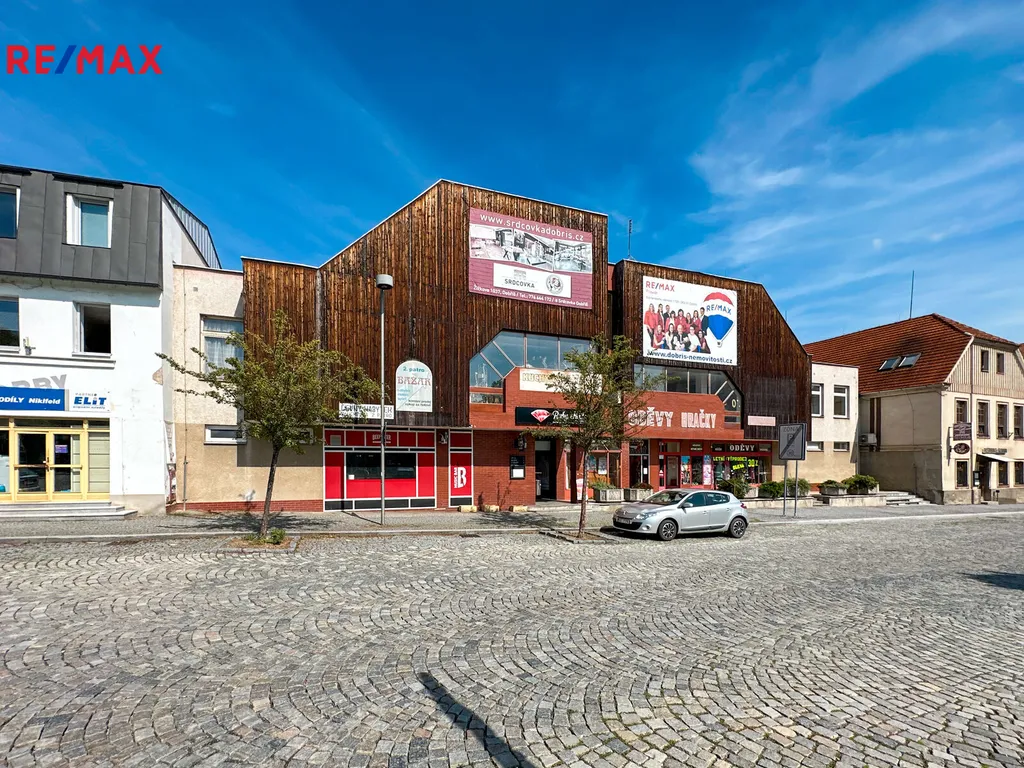 Nabízím k prodeji komerční prostory, skládající se ze tří samostatných jednotek, které celkově tvoří 1/2 prostorného obchodního objektu Černá Labuť na Mírovém náměstí v obci Dobříš, okres Příbram.