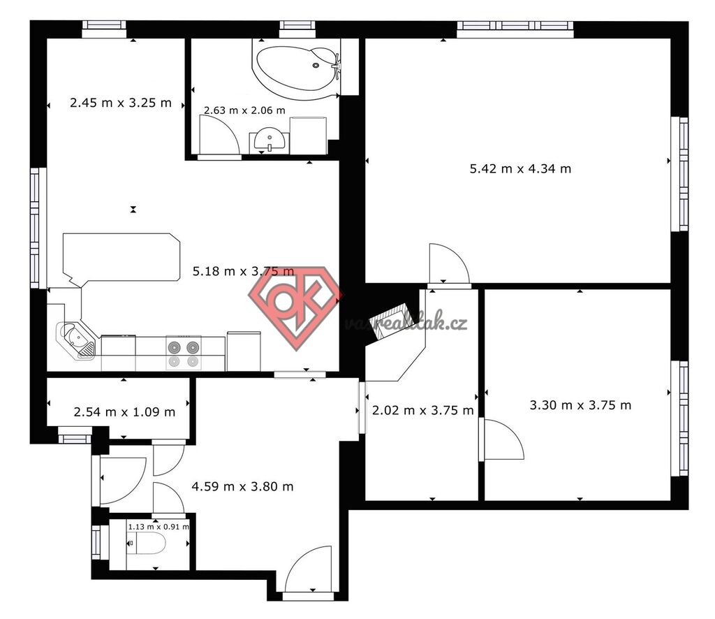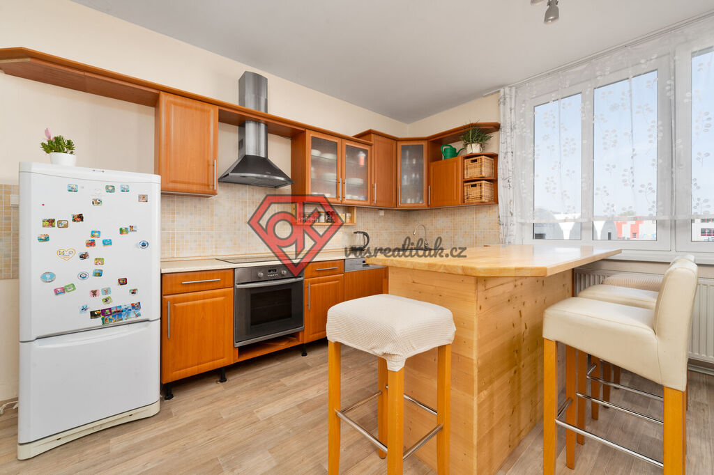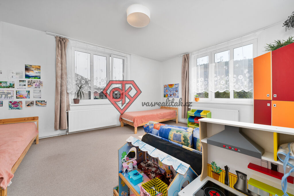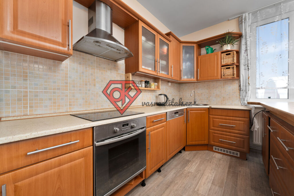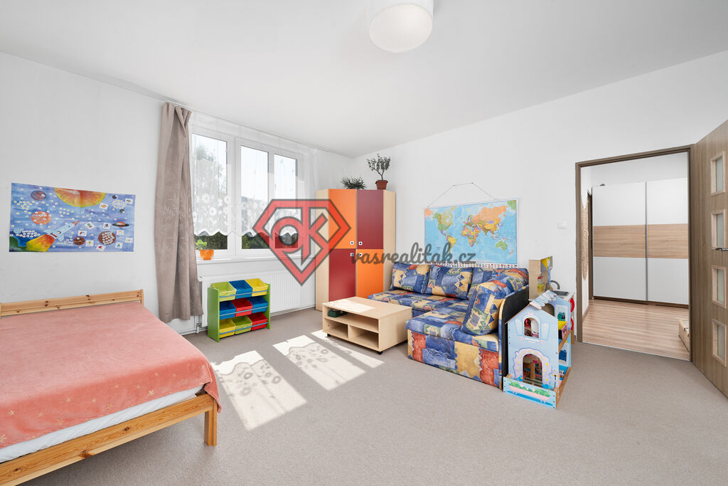 Dispozičně se byt skládá z kuchyně s obývacím koutem, dětského pokoje, ložnice, komory, koupelny a toalety.