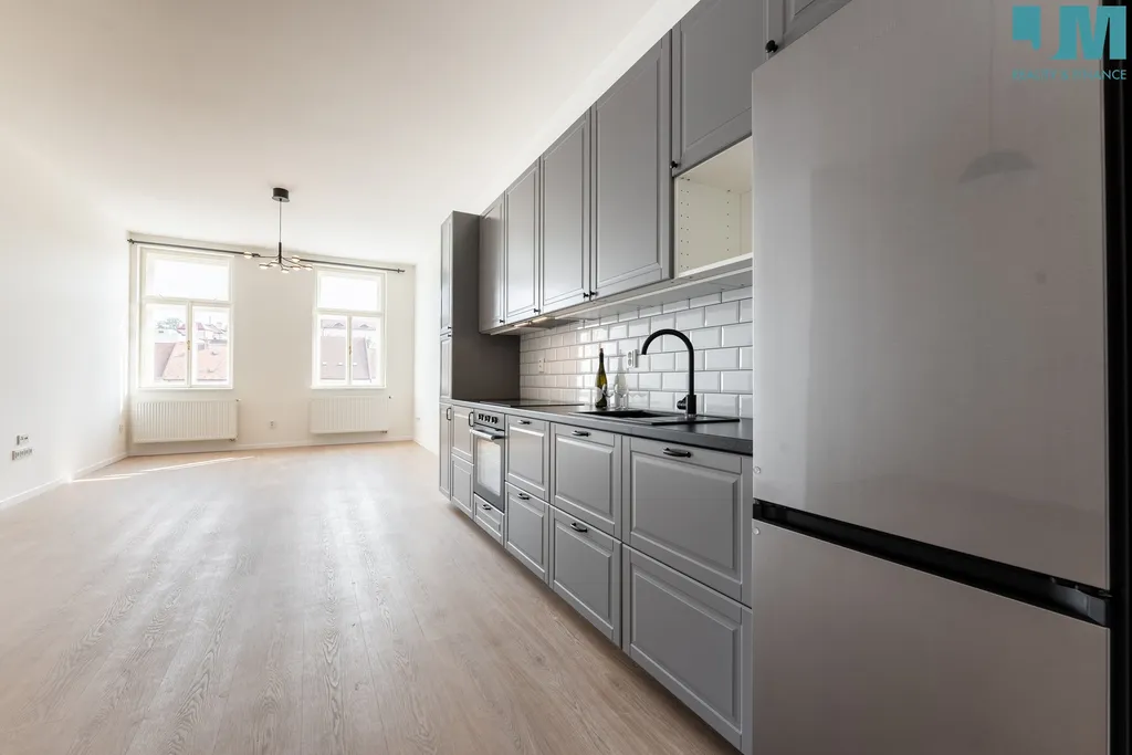 Byt je zcela nový – nové podlahy, elektroinstalace, moderní kuchyňská linka se spotřebiči (lednice, myčka, trouba, indukční varná deska). Dispozici doplňují nově osazené stylové a krásné dveře mezi chodbou a kuchyní s obývacím pokojem (aktuálně nejsou zachyceny na fotografiích). Vytápění je řešeno s možností digitálního ovládání.
