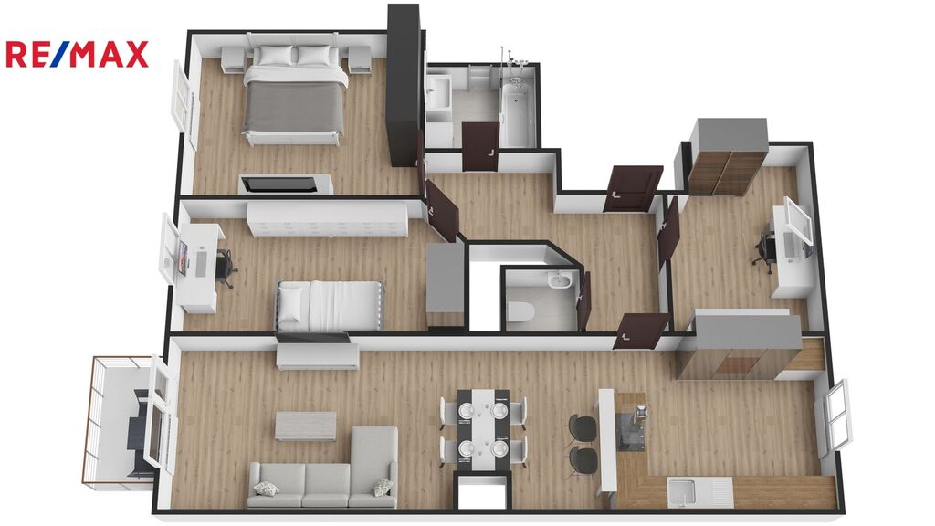 Byt je dispozičně velmi dobře řešený. Je zde prostorná vstupní předsíň (9 m²), velký obývací pokoj s kuchyňským koutem (37,3 m²), ložnice (16 m²), dětský pokoj (13,1 m²), pracovna (10 m²). Dále koupelna s vanou (4,3 m²) a samostatná toaleta s umyvadlem (1,9 m²).