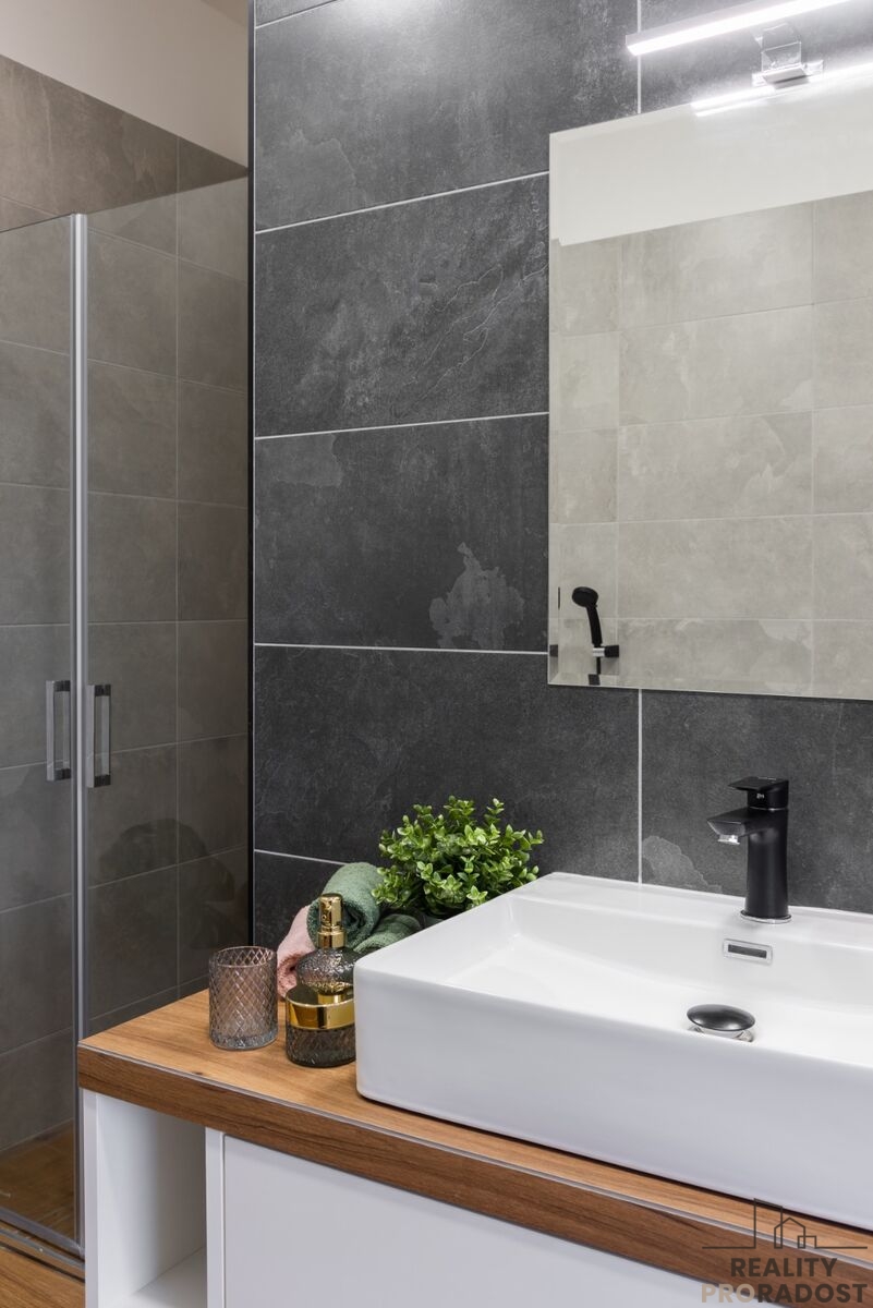 Již při vstupu do bytu zaujme podlahové vytápění a klimatizace, které zajišťují dokonalý komfort a pohodlí. Koupelna se sprchovým koutem, samostatné WC, ložnice se šatnou, prostorný obývací pokoj s kuchyňským koutem s průchodem do zimní zahrady a sklad.