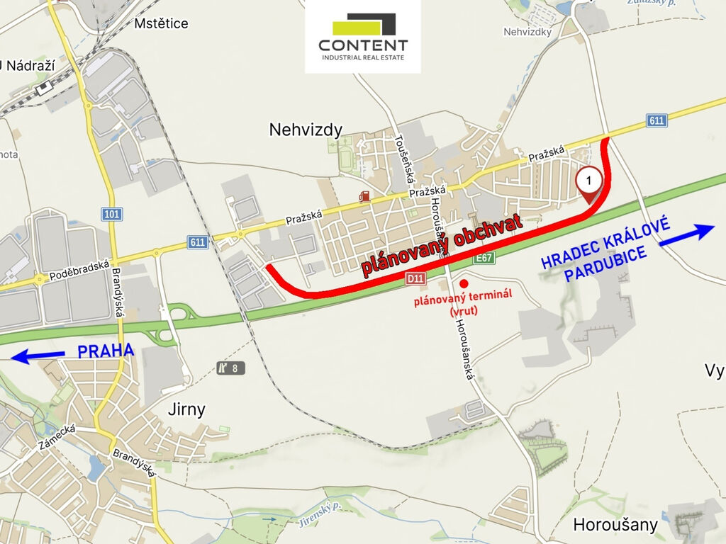 Praha-východ, Nehvizdy. V exkluzivním zastoupení majitele a bez provize nabízíme prodej stavebního pozemku pro komerční využití o celkové velikosti 9021 m². Pozemek se nachází svou polohou podél dálnice D11 na prvním exitu č. 8 z Prahy - Hradec Králové/Pardubice. Jedná se o investiční pozemek s potenciálem budoucího zhodnocení, díky napojení na infrastrukturu a ucelení území na větší celky.