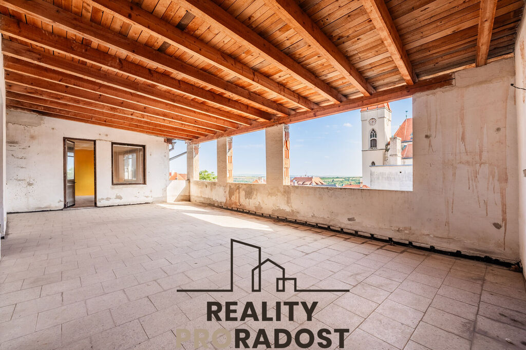 Rovná střecha budovy nabízí další velký potenciál k vybudování nádherného panoramatického apartmánu nebo bytu s výhledem na Znojmo.