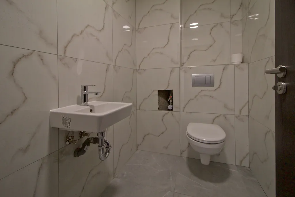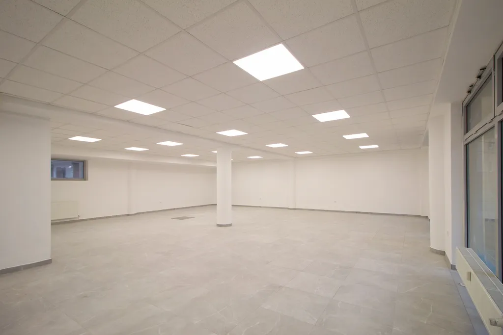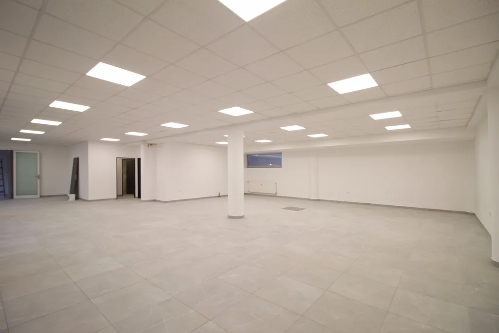 Komerční prostor je zrekonstruován. Na podlaze je položena velkoformátová dlažba a na stropě jsou snížené podhledy se světly. K dispozici jsou 2 WC a kancelář.