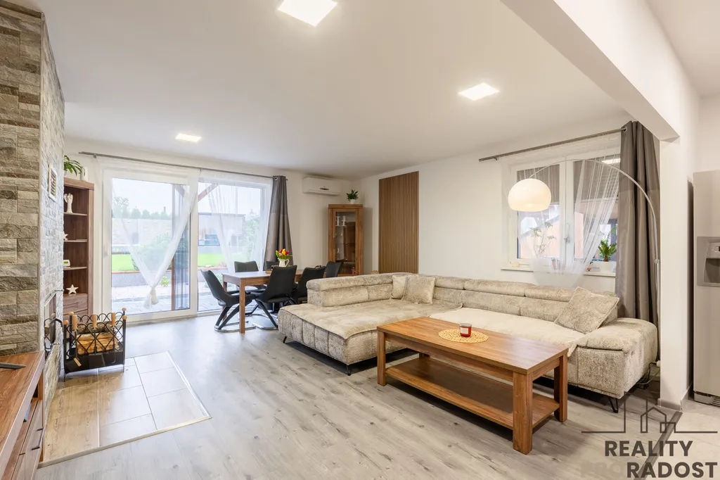 Prostorný a světlý obývací pokoj s přímým vstupem na terasu a do zahrady, ideální pro rodinné setkávání a relaxaci.