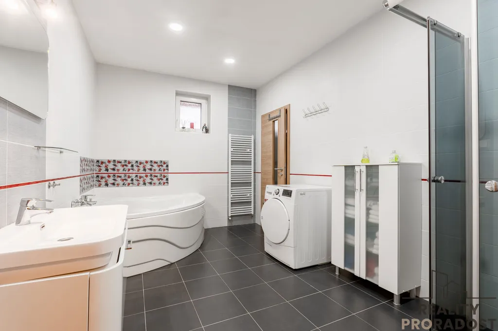Stylová koupelna s rohovou vanou i sprchovým koutem, kde si můžete dopřát zasloužený odpočinek.