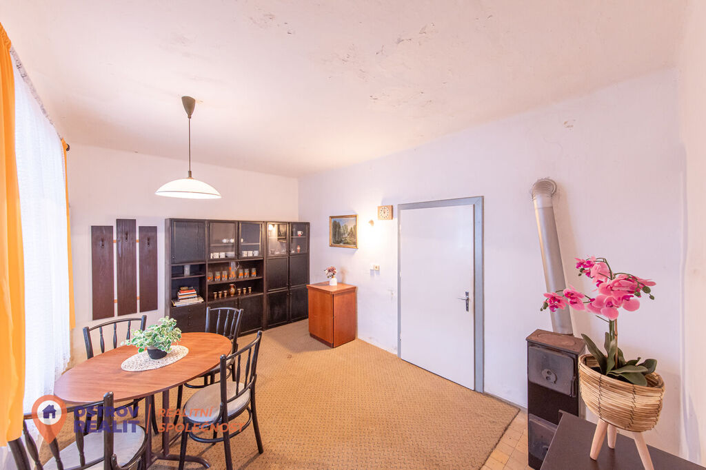 Po vstupu do domu vás přivítá menší předsíň, z níž je přímý vstup do garáže, kde můžete pohodlně zaparkovat. Z předsíně se dostanete také do spíže, která nabízí možnost přestavby na další koupelnu. Centrální chodba vás zavede do prostorné jídelny s praktickou kuchyňskou linkou, navazující na pokoj s výhledem na zahradu a dále na chodbu se stylovým dřevěným schodištěm do obytného patra, kde najdete prostorný pokoj s nádherným výhledem do okolní krajiny. V přízemí se také nachází samostatný pokoj a průchozí pokoj vedoucí na prosklenou verandu, kde si můžete vytvořit zimní zahradu nebo relaxační kout. Koupelna se sprchovým koutem a WC je umístěna u schodiště, poblíž dalších praktických místností využitelných jako komory nebo dílna.