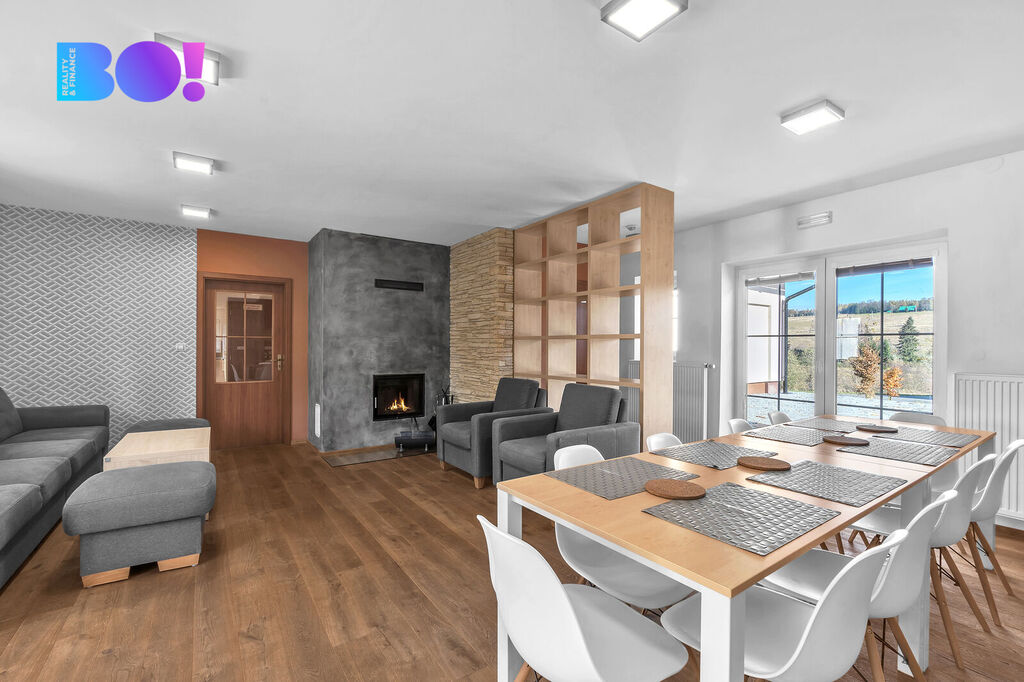 Dispozice 1.NP - vstupní hala, společenská místnost s centrální kuchyní se vstupy na zahradu, pergolu s grilem a dětským koutkem, 1x apartmán, 2x sklad, lyžárna, garáž - dílna s možností vybudování dalšího pokoje, ev. wellness nebo malé konferenční místnosti. 2.NP - 4x pokoj, vstup na půdu.