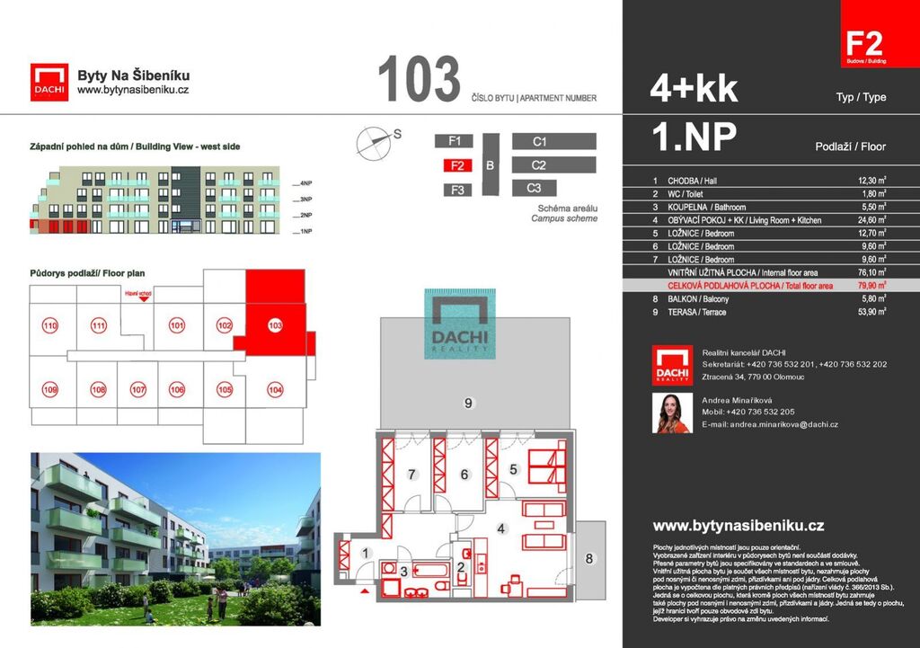 Navazujeme na úspěch první etapy a přinášíme vám jedinečnou příležitost pořídit si nový domov v atraktivním projektu Byty Na Šibeníku. DACHI, prodejce a partner developera, vám v rámci druhé etapy nabízí ke koupi byt 4+kk (č. 103) o ploše 79,9 m s terasou o velikosti 59,7 m. Byt se nachází v 1. nadzemním podlaží bytového domu F2, který je součástí šestipodlažního objektu se čtyřmi nadzemními a dvěma podzemními podlažími.