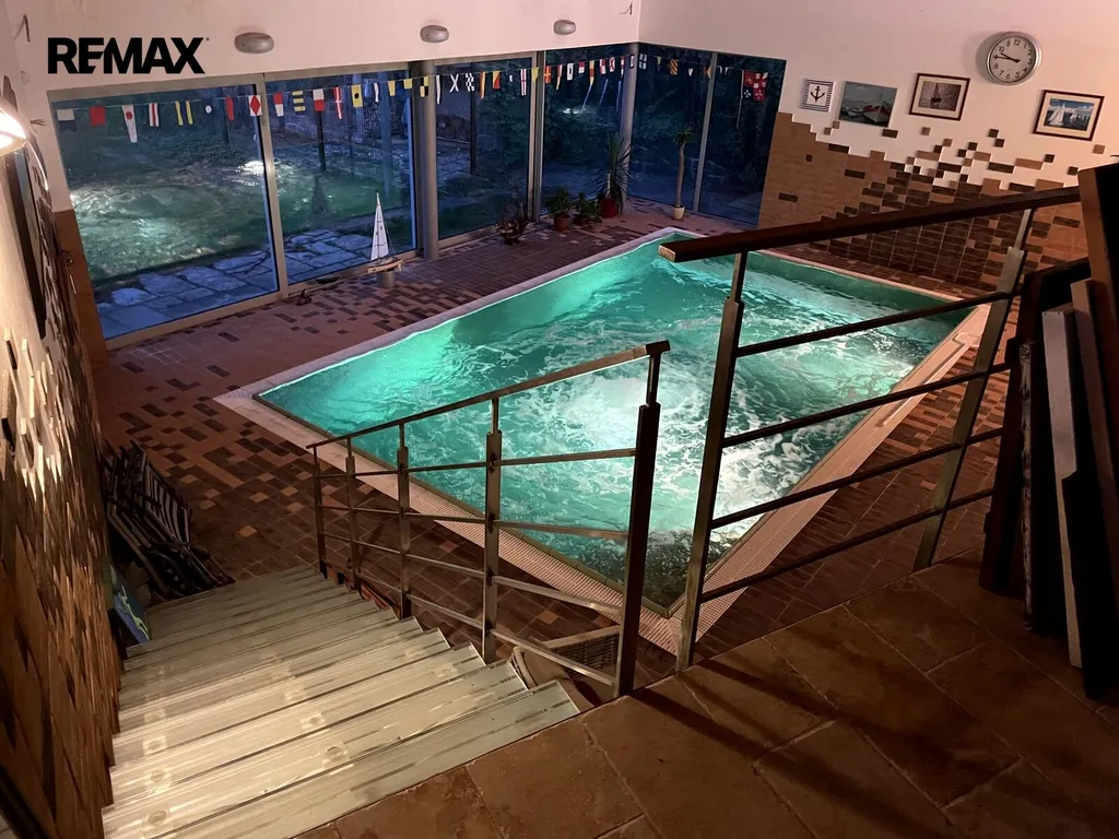 Krytý vyhřívaný bazén (o rozloze 131 m²) s přímým vstupem z obývacího pokoje, který je ideální pro relaxaci i celoroční koupání. Bazén je doplněn saunou a příslušenstvím, což zajišťuje maximální komfort a wellness zážitky přímo u Vás doma.