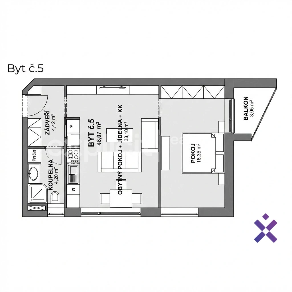 Nabízený byt o dispozici 2+kk má podlahovou plochu 48 m² a nachází se v přízemí domu. Výhodou je přímý vstup bez schodů z parkoviště, který zvyšuje komfort každodenního užívání.
