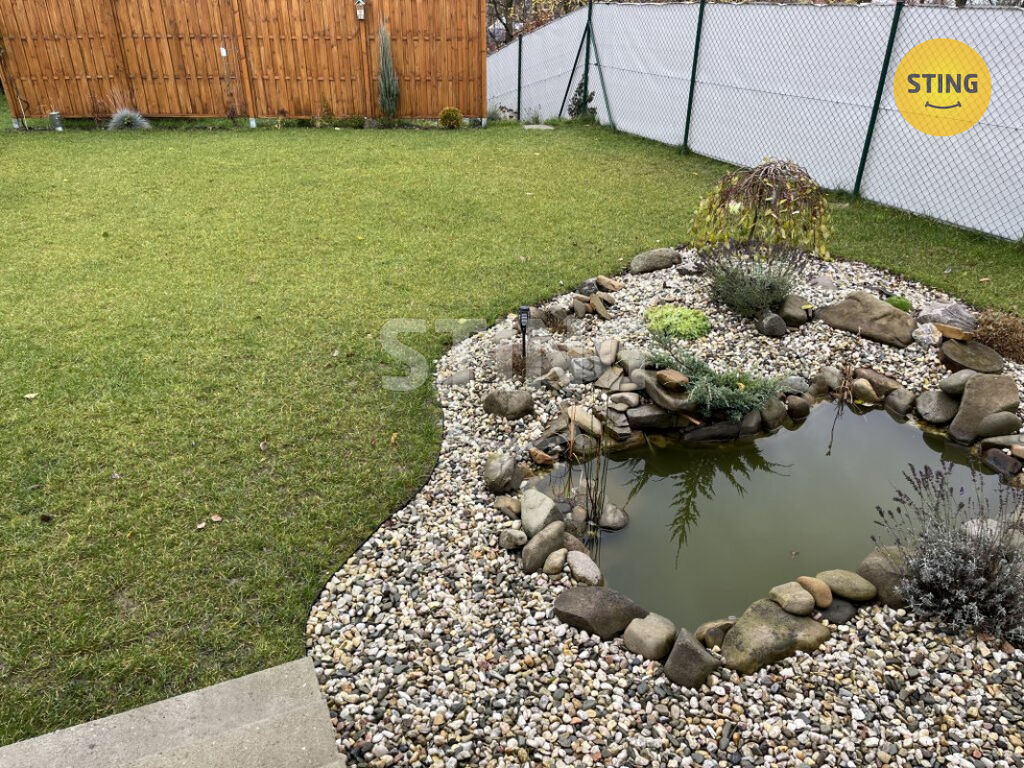 Udržovaná zahrada s okrasným jezírkem je ideálním místem pro odpočinek i rodinné aktivity.