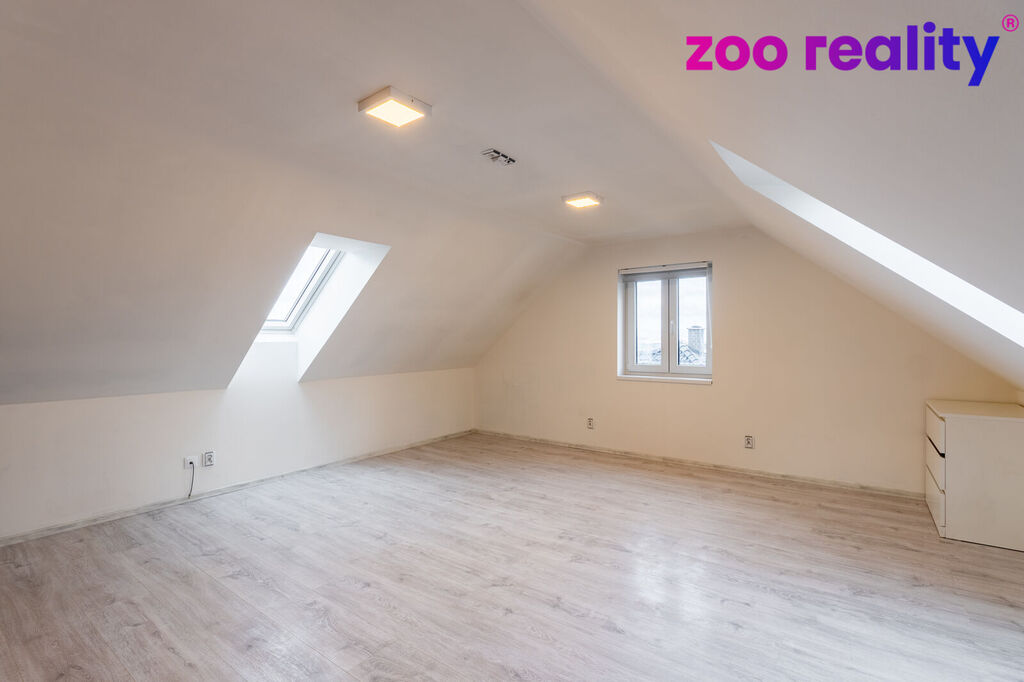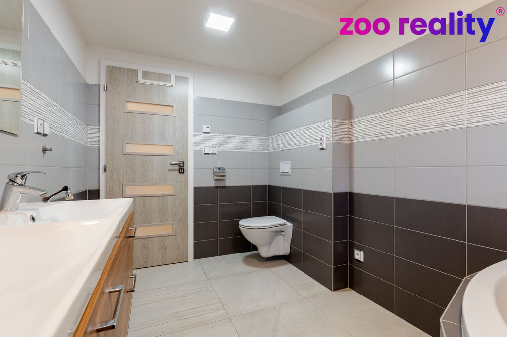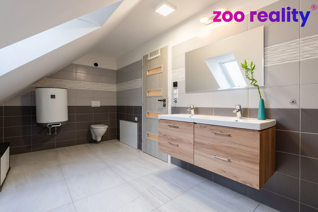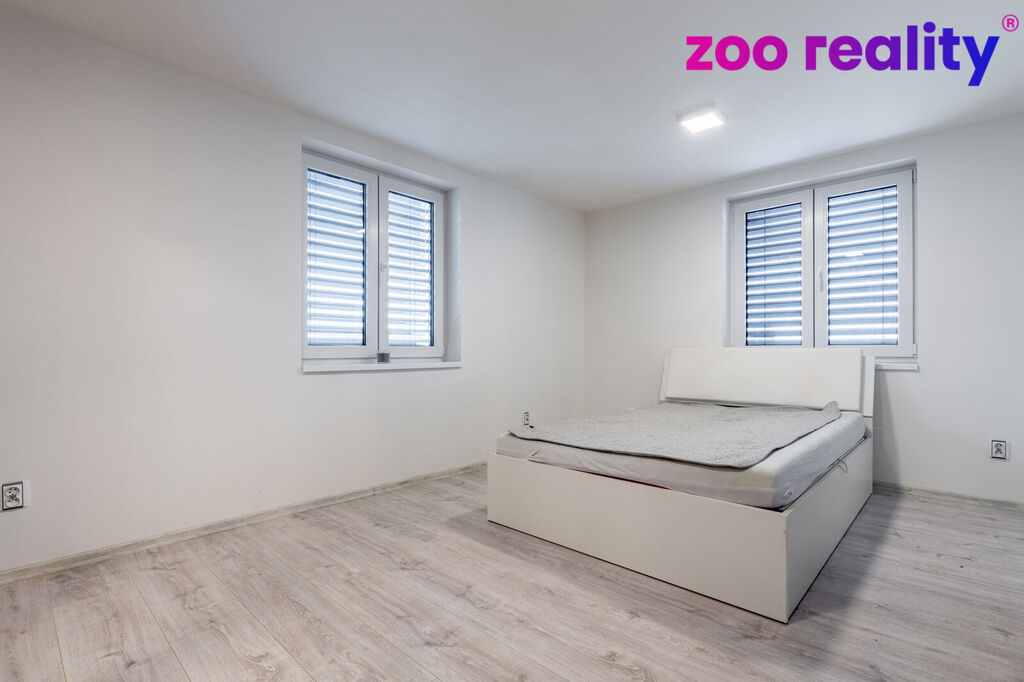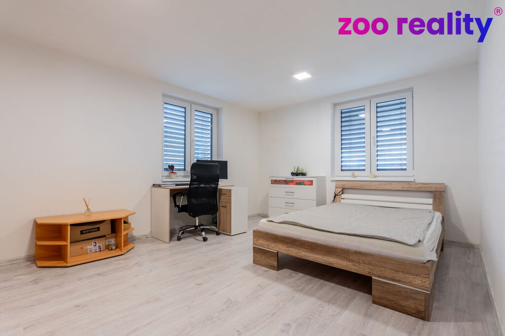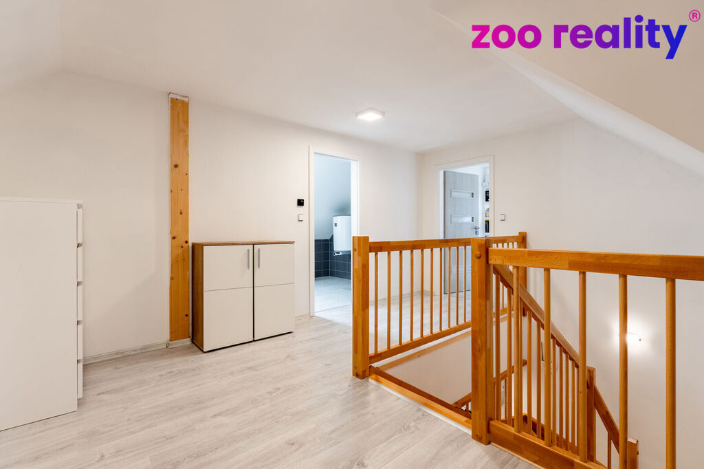 V přízemí domu nalezneme 3 samostatné ložnice, větší a menší koupelnu, obývací pokoj spojený s kuchyní, technickou místnost, garáž a výstup na 30ti metrovou terasu. V prvním patře jsou situovány dva velké pokoje. Jeden o velikosti 22m2 a druhý 38m2 včetně šatny. Samozřejmostí je další koupelna a menší komora. V suterénu domu jsou 3 další místnosti, každá o ploše 25 až 35m2. Nyní využívané jako skald dřeva, dílna a letní kuchyně včetně samostatné toalety. Celý suterén je z betonového monolitu.