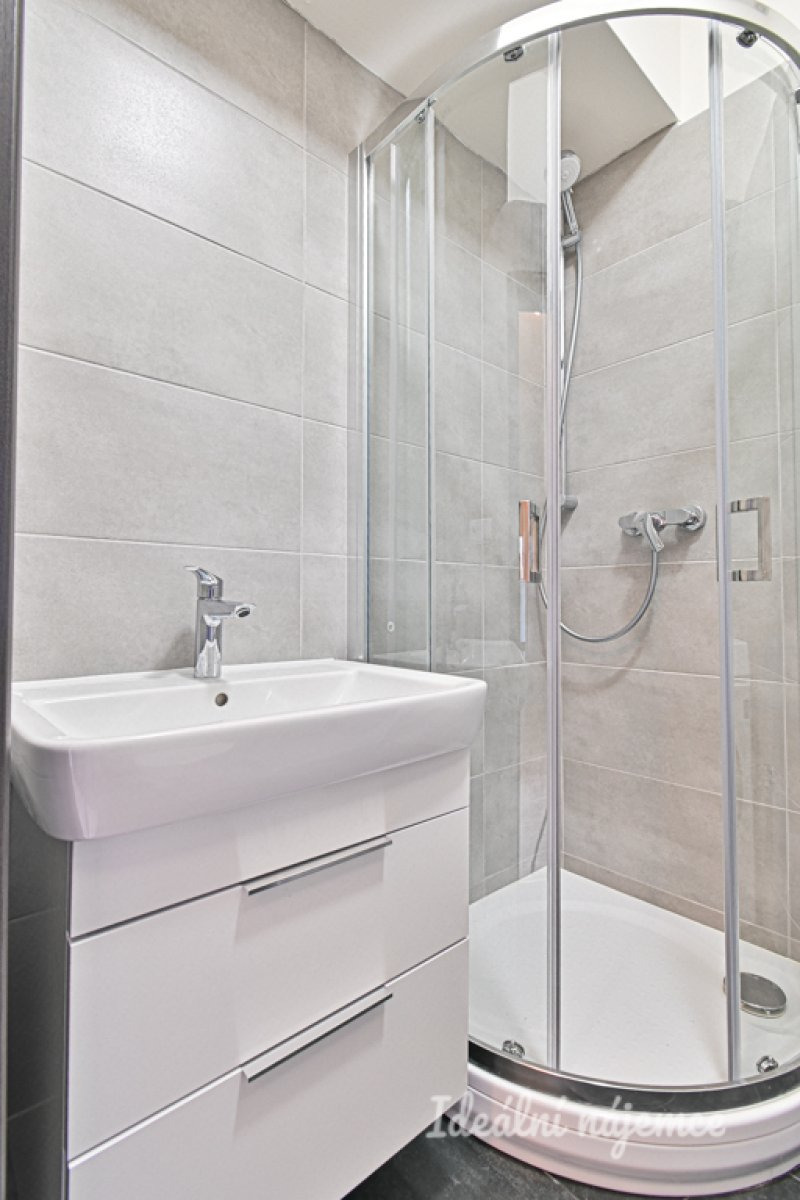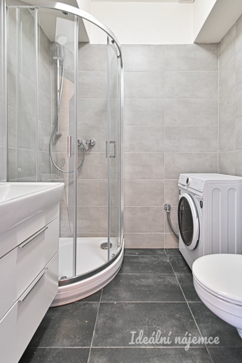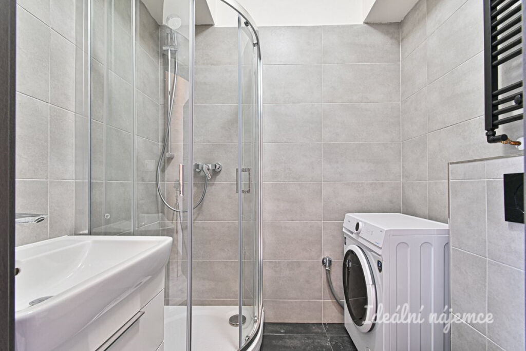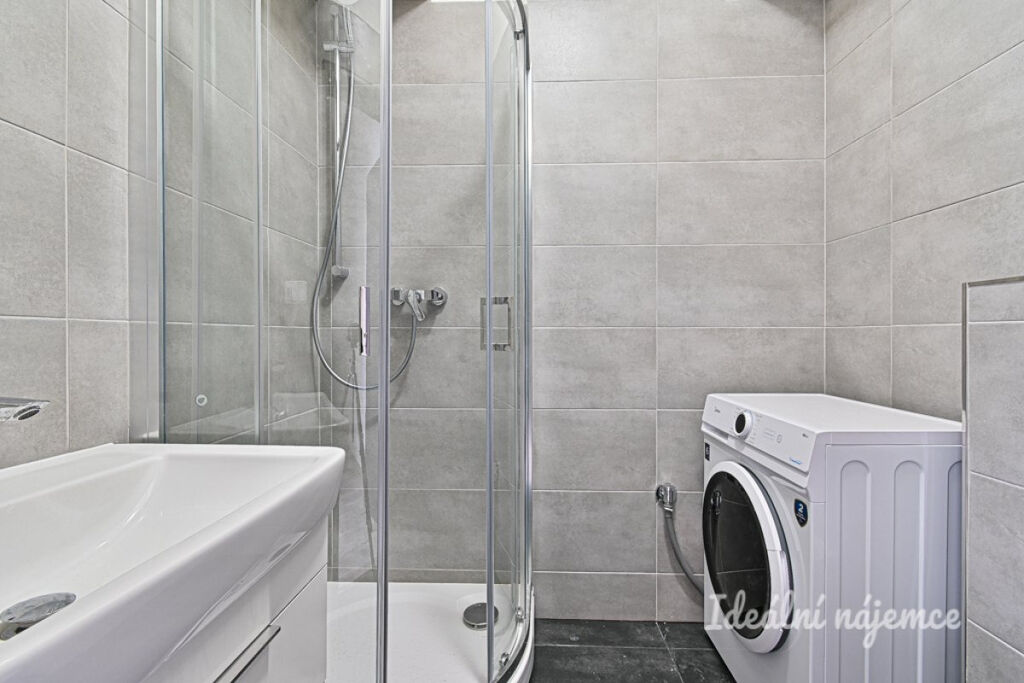 Moderní koupelna je zařízena sprchovým koutem, umyvadlem a zrcadlem, přičemž toaleta je součástí koupelny. K dispozici je také pračka.