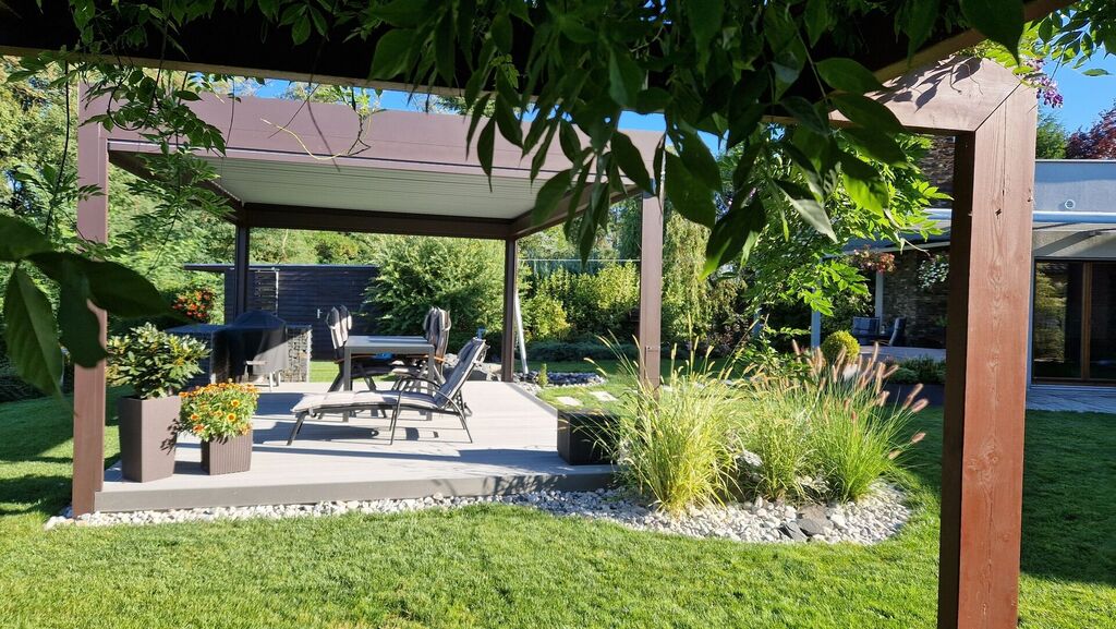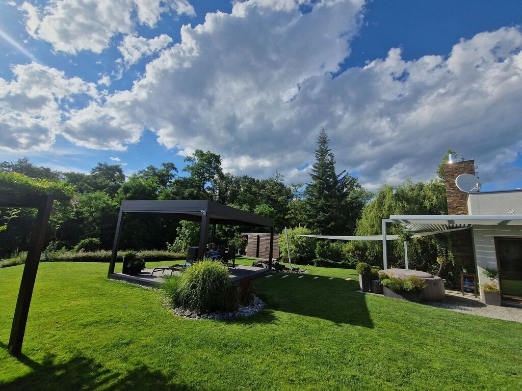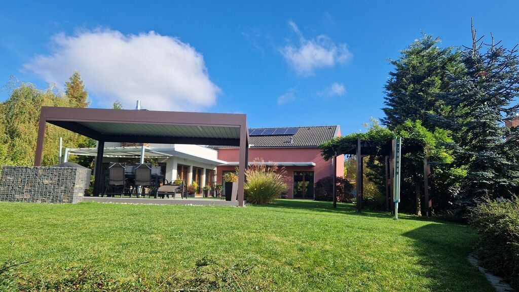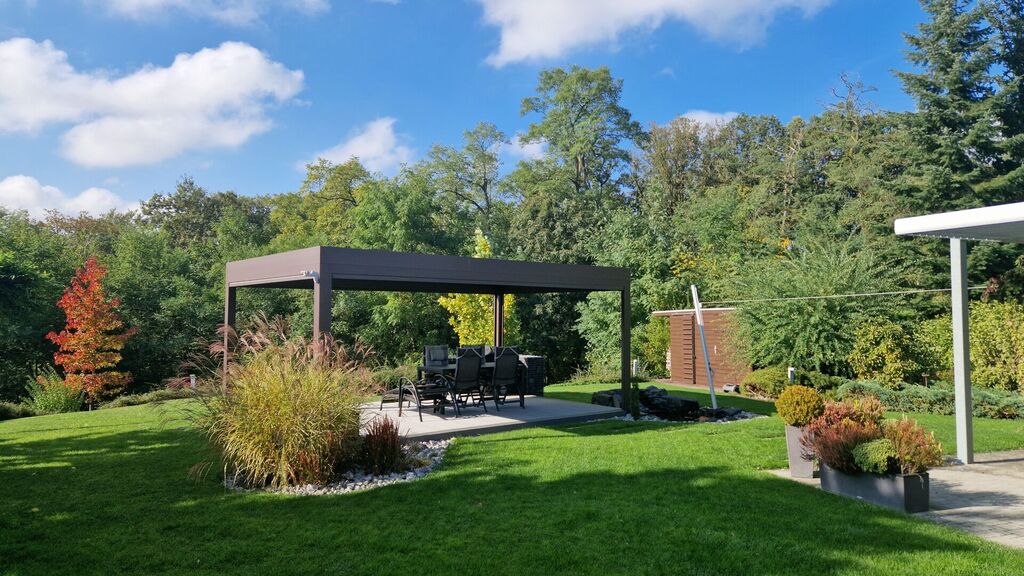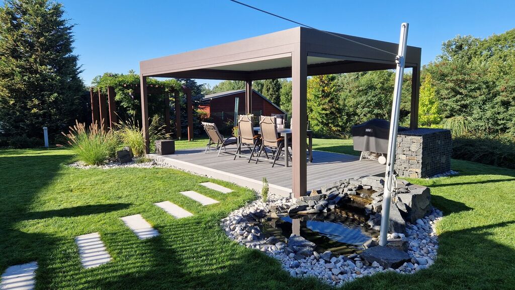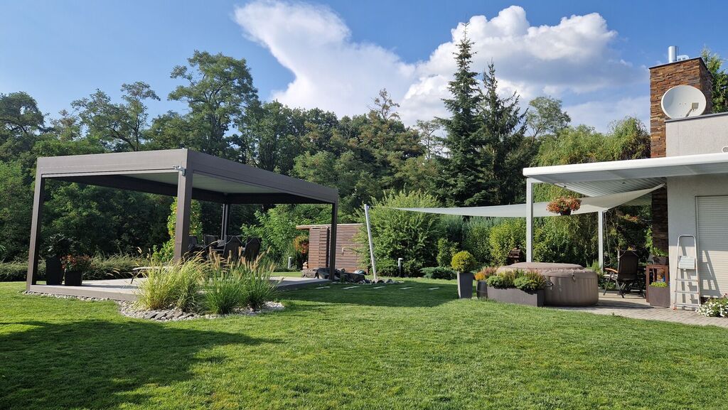 V zahradě je nově vybudováno sezení pod hliníkovou bioklimatickou pergolou s elektricky ovládanými stěnami a osvětlením, rolovací stínící