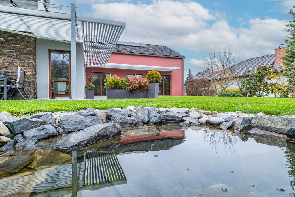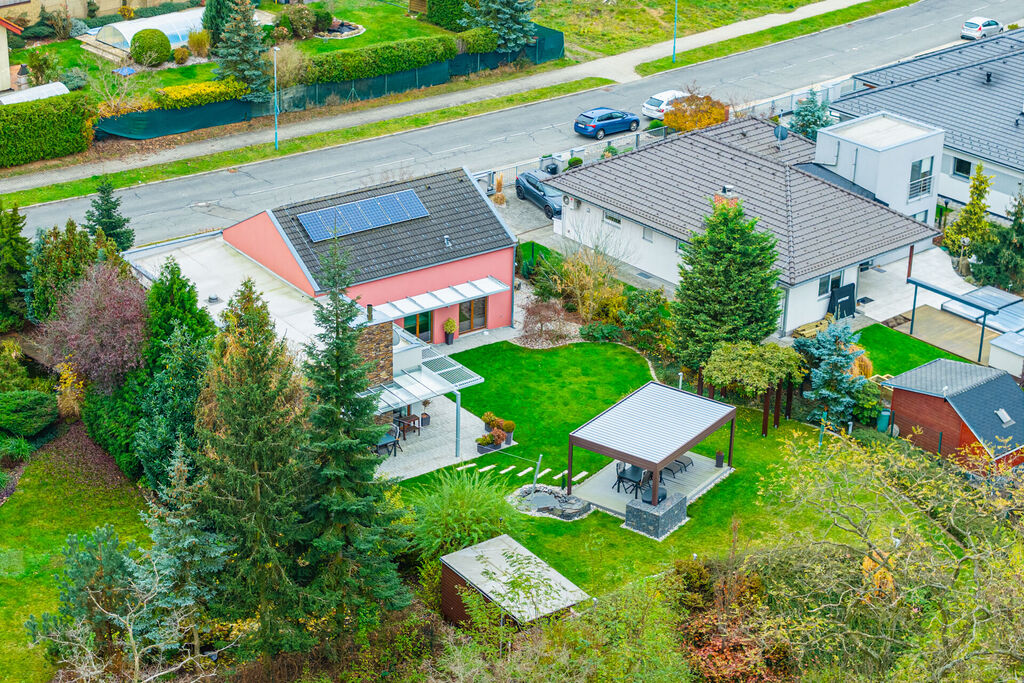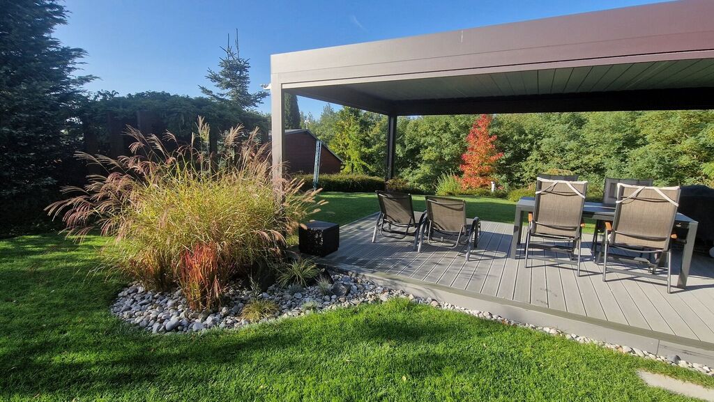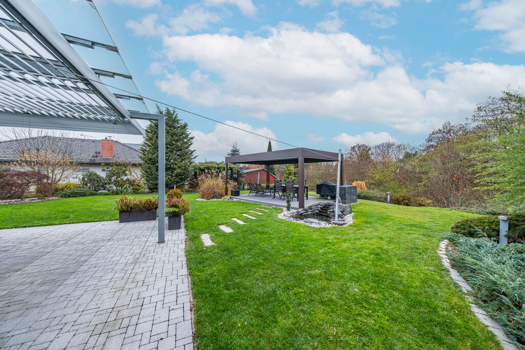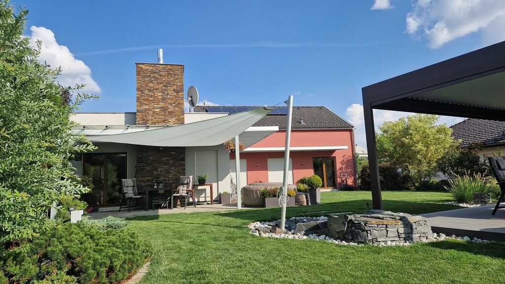 V zahradě je nově vybudováno sezení pod hliníkovou bioklimatickou pergolou s elektricky ovládanými stěnami a osvětlením, rolovací stínící
