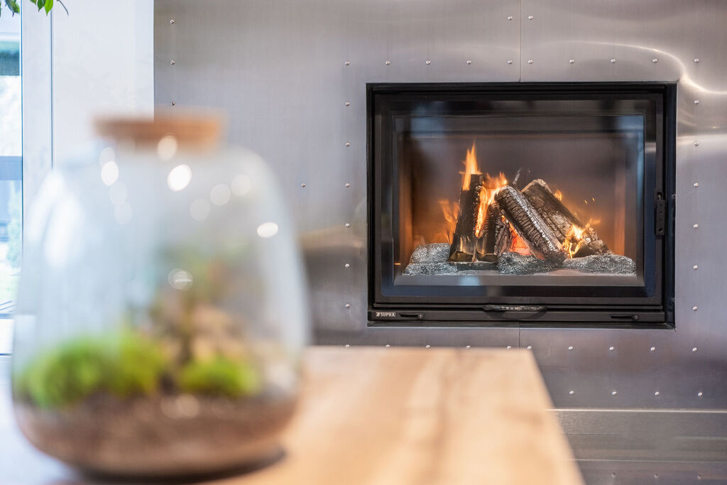 V obývacím pokoji je zabudovaný krb, který krásně vytopí obytnou část domu (13 kW).