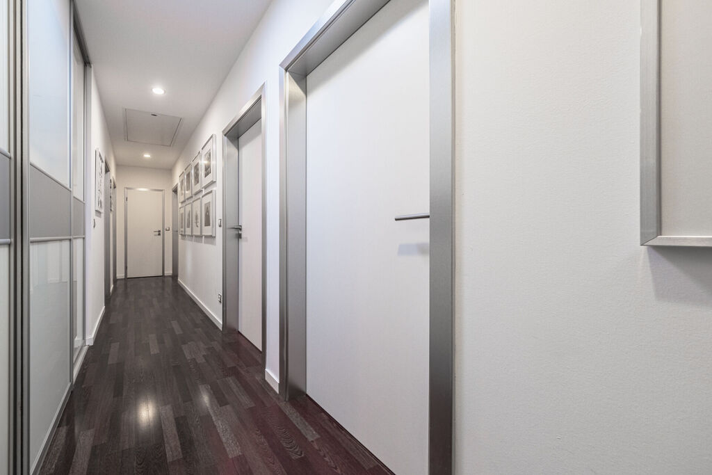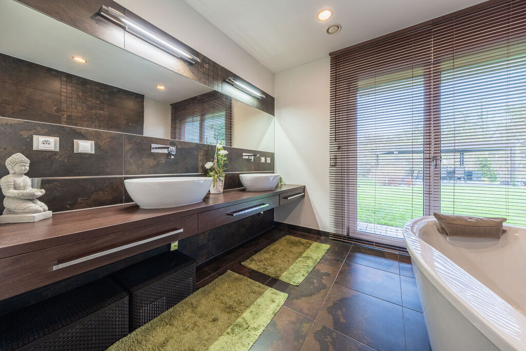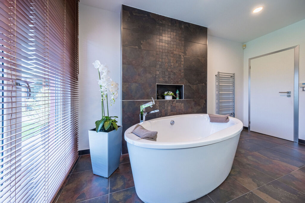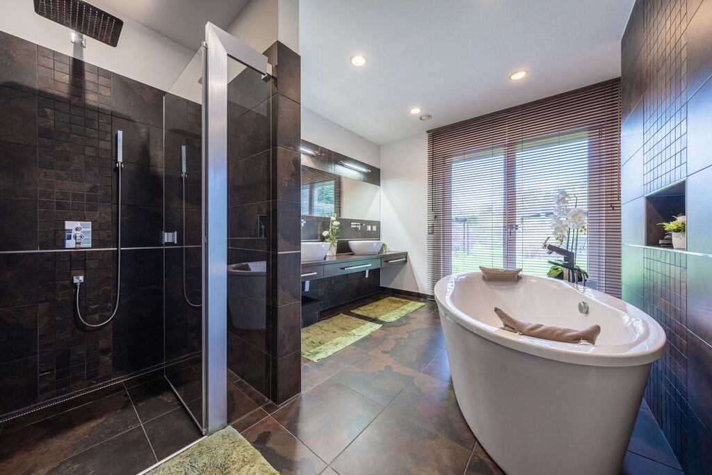 V klidové části domu oddělené dveřmi se nachází šatna, technické zázemí, pracovna, velká koupelna se sprchovým koutem a volně stojící vanou, ze které díky francouzskému oknu krásně vidíte do zahrady. Dále pak navazuje ložnice a pokoj pro hosty.