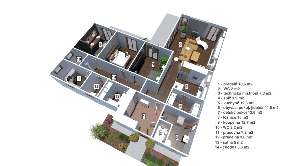 Samotnou dispozici tvoří: vstupní chodba, kde jsou po levé straně velké vestavné skříně, v nichž je ukryto spousty úložného místa. Po pravé straně jsou dveře do technické místnosti, kde je veškeré technické zázemí k domu a zároveň vstup na zahradu z boku domu. Díky navazující centrální chodbě jdeme do obytné části, kde je kuchyň s jídelním prostorem a komorou, dále prostorný obývací pokoj s krbem, ze kterého díky velkým oknům krásně vidíme do zahrady a přilehlého lesa. Zahrada je dalším místem, které vás naprosto okouzlí.