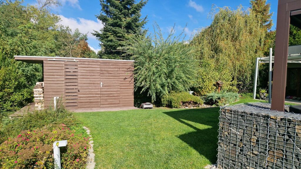 plachta na terase, automatická sekačka na trávu, brána na elektrické ovládání. Zahrada v sobě ukrývá ještě zahradní domek a v zadní části pozemku se díky brance dá projít do navazujícího lesíku.